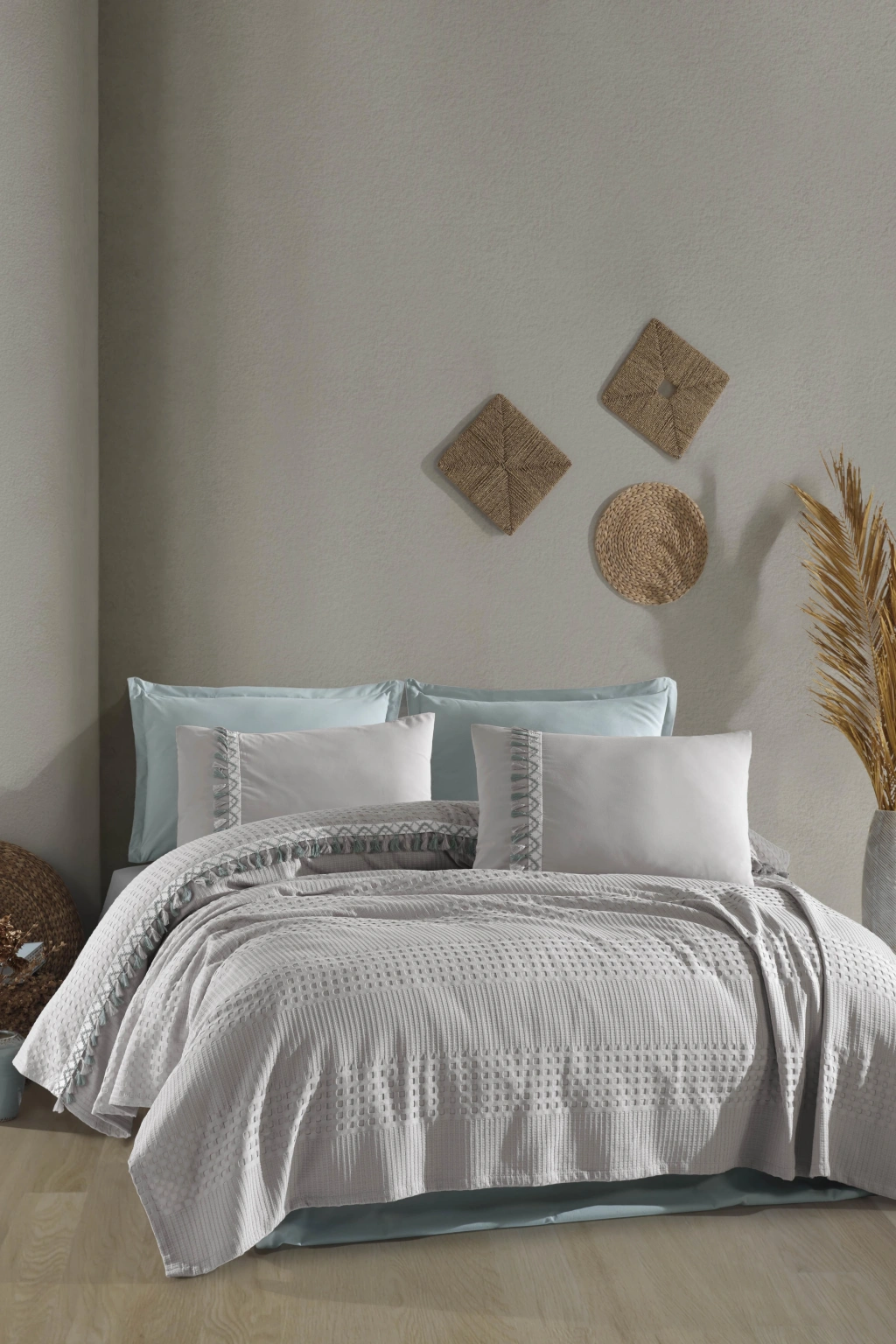 Clasy %100 Pamuk Butik Çift Kişilik Püsküllü Pike Takımı Bohamline V10 Açık Gri