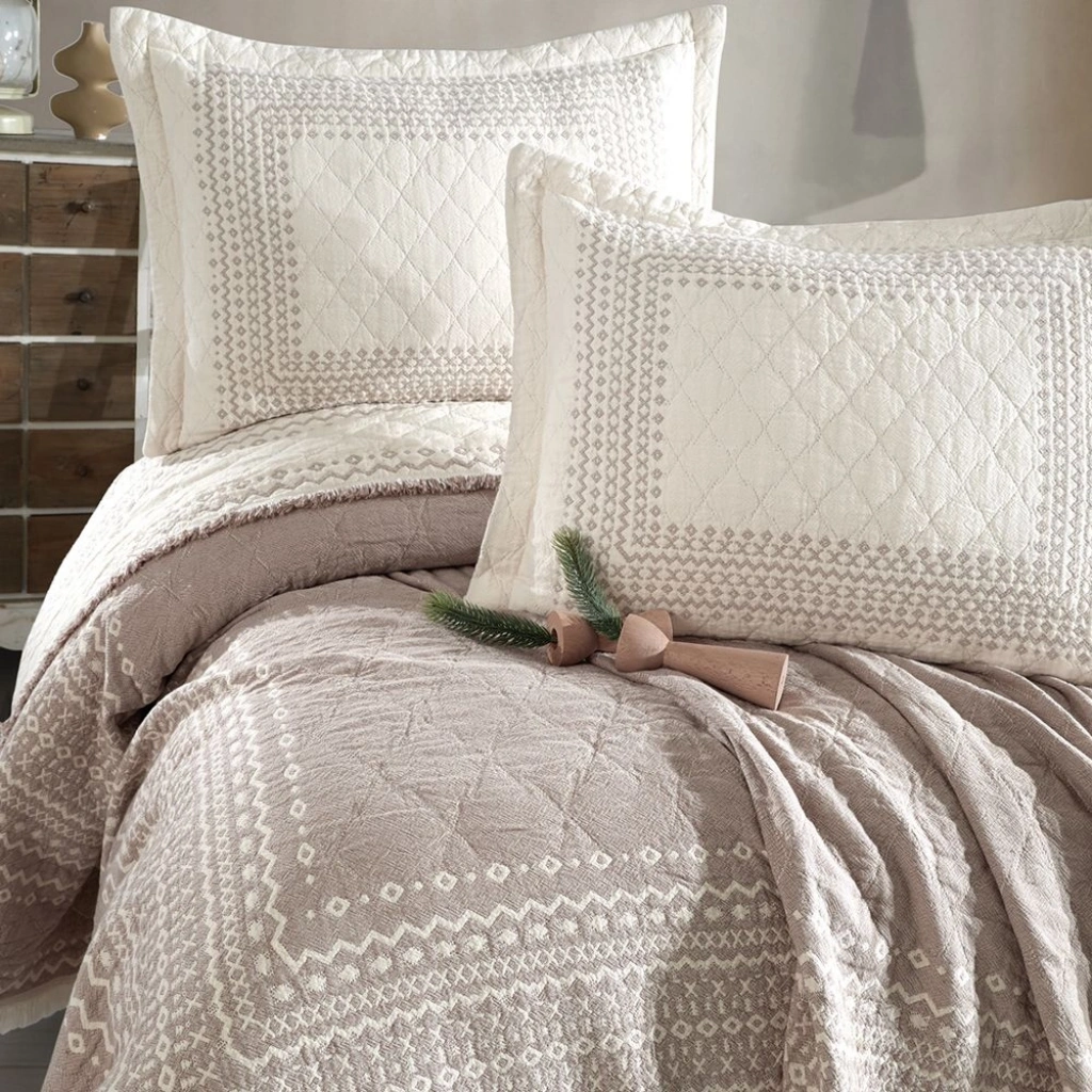 Clasy %100 Pamuk Çift Kişilik Müslin Yatak Örtüsü Nomada V2 Kahve