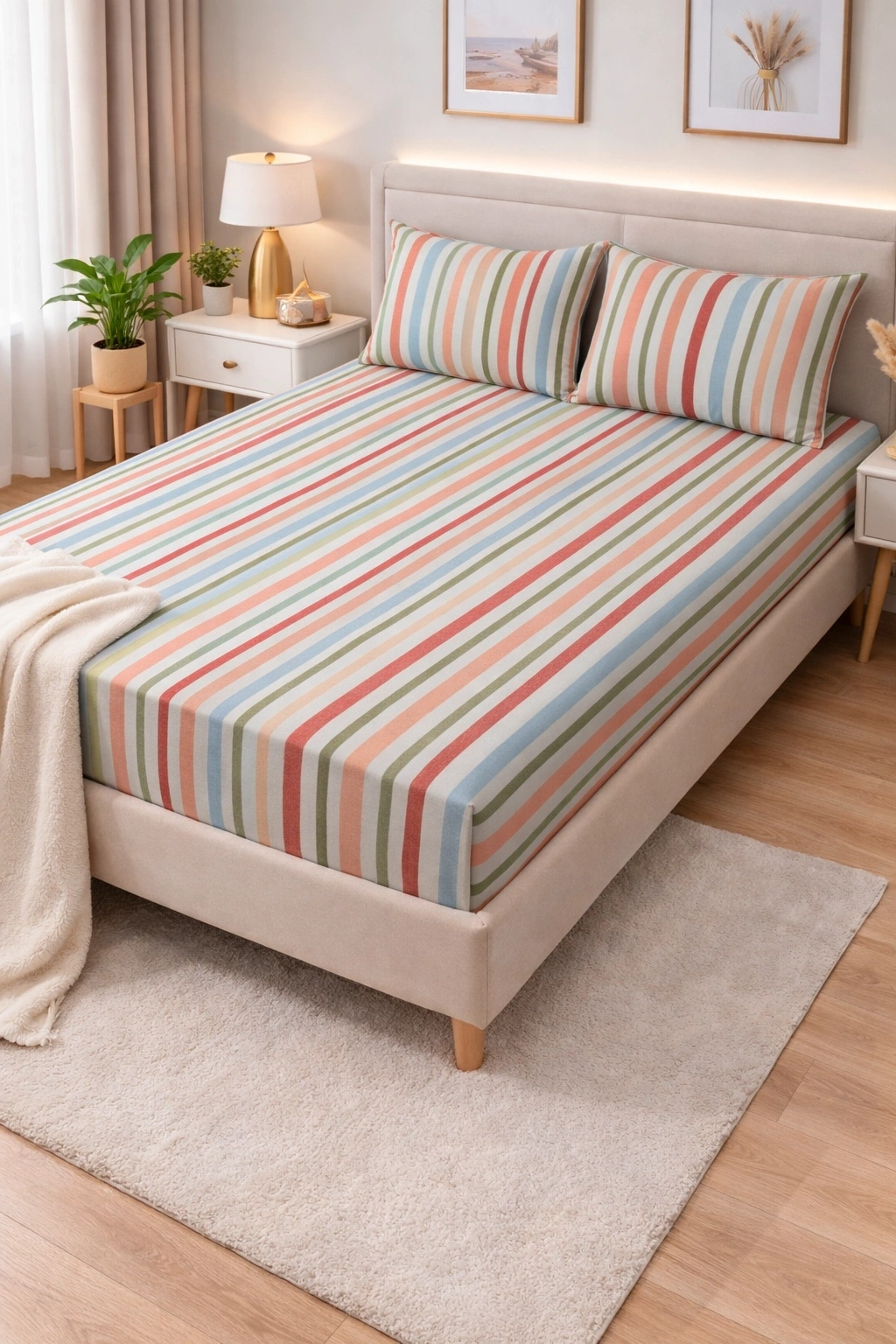 - Çizgili deseni ve Çok rengiyle yatak odanıza modern bir görünüm katar.