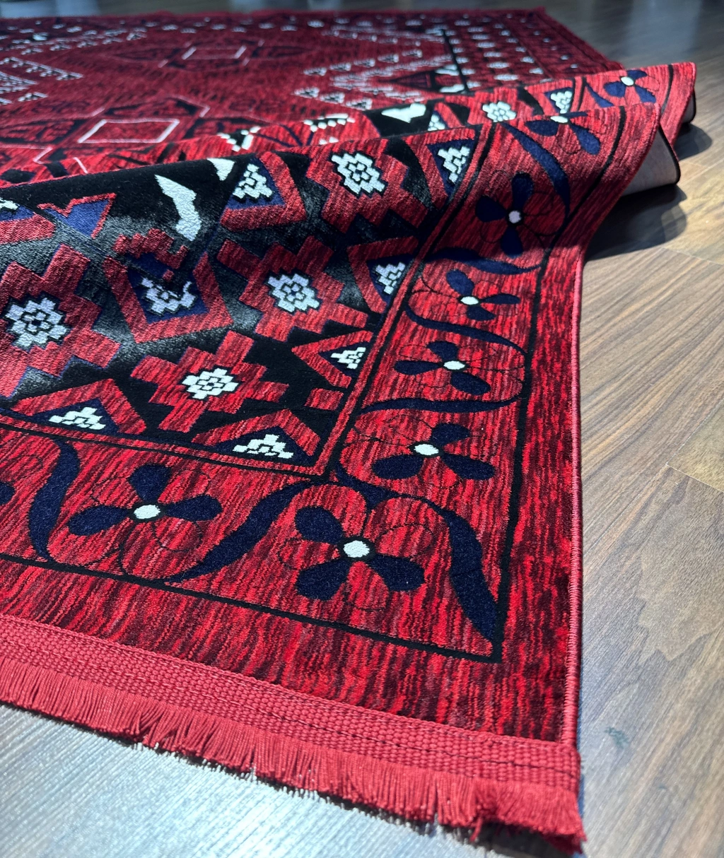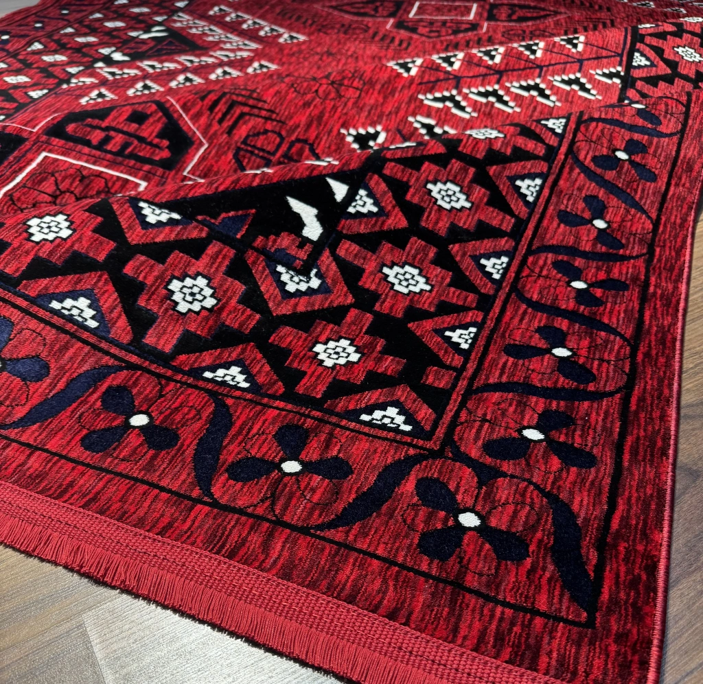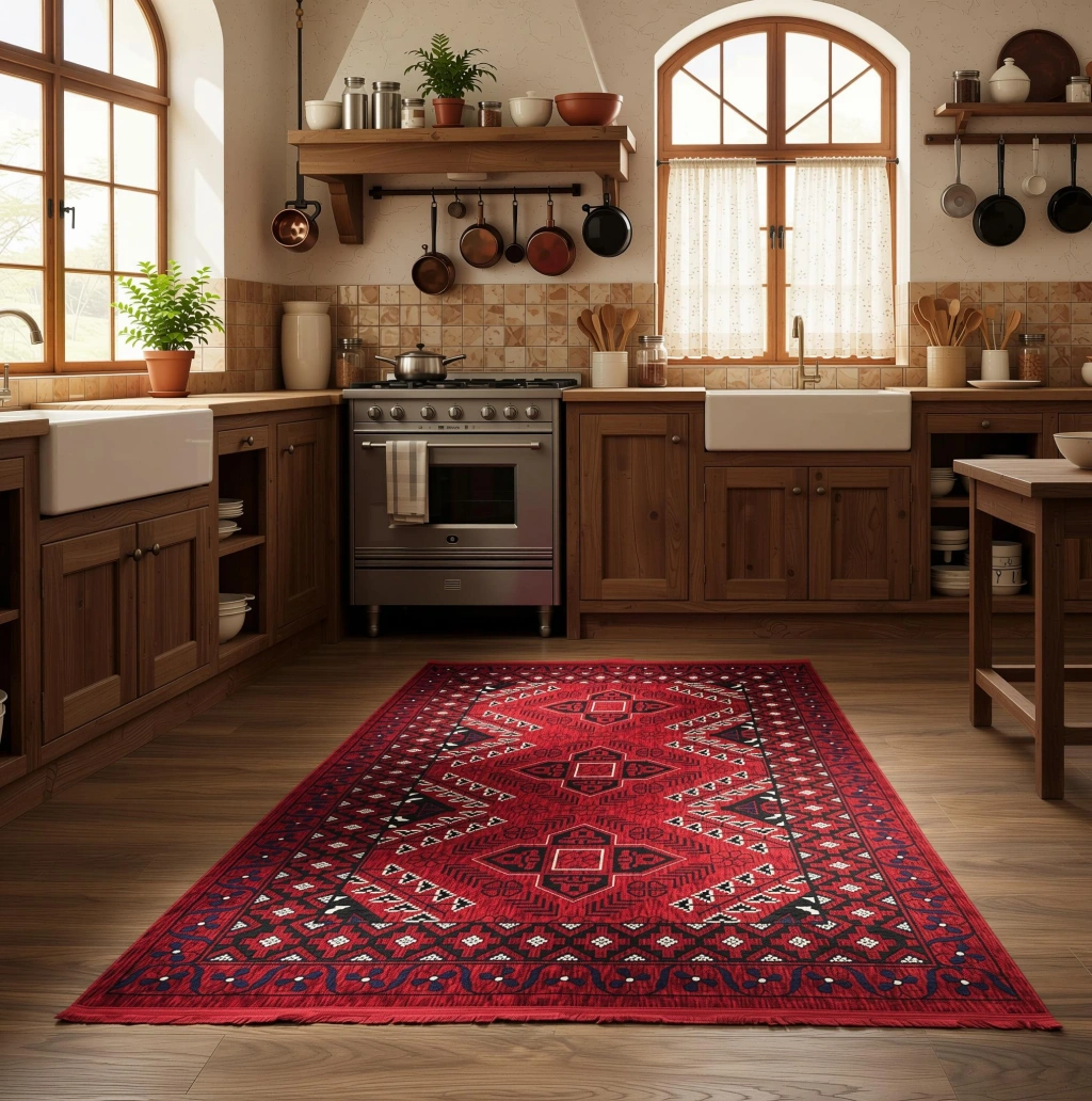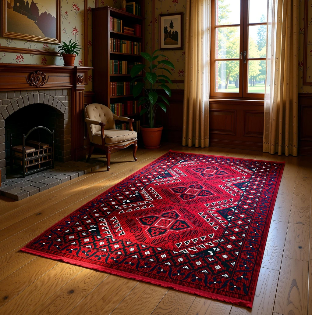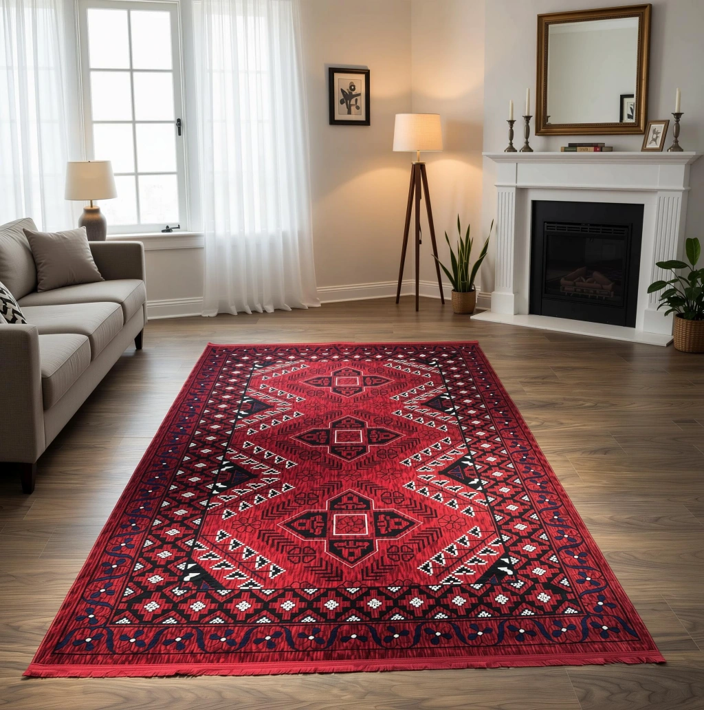 Tarz sahibi tasarımı ve canlı kırmızı rengi ile dikkat çeken halı, mekana sıcaklık ve zarafet katıyor.