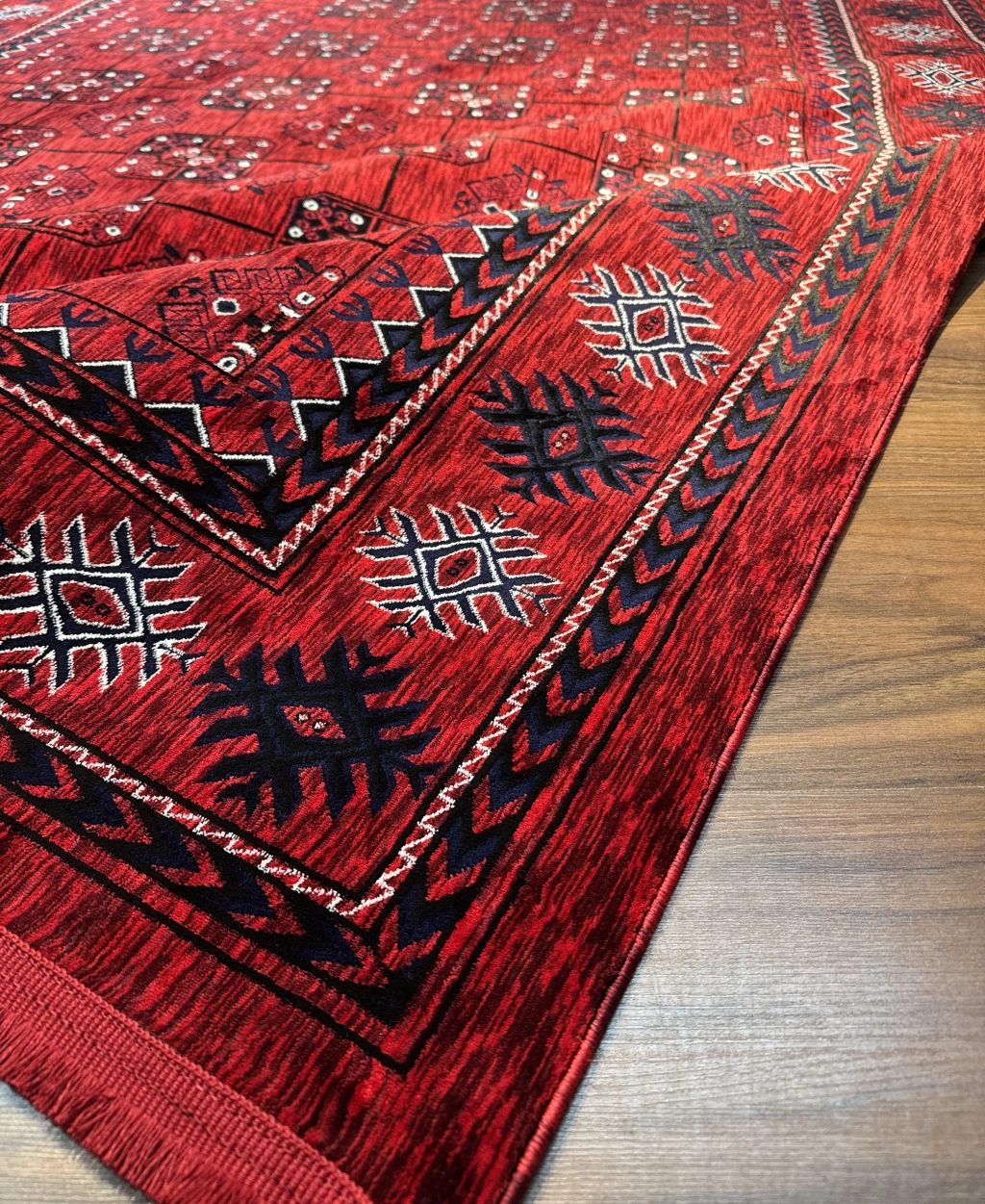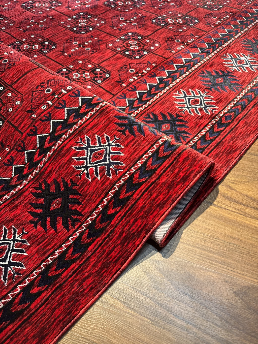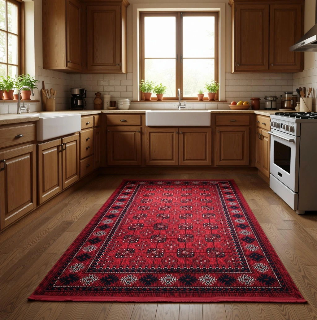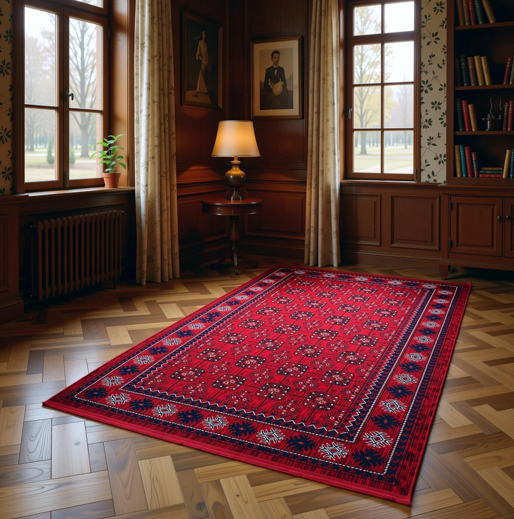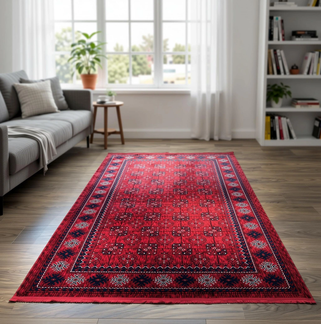 Tarz sahibi tasarımı ve canlı kırmızı rengi ile dikkat çeken halı, mekana sıcaklık ve zarafet katıyor.